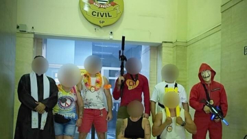 Reprodução/Polícia Civil Policiais fantasiados de Chapolin Colorado e de padre, prenderam um homem de 34 anos por furtar seis celulares em um bloco de Carnaval, no bairro da Consolação, região central de São Paulo, no último domingo (23).