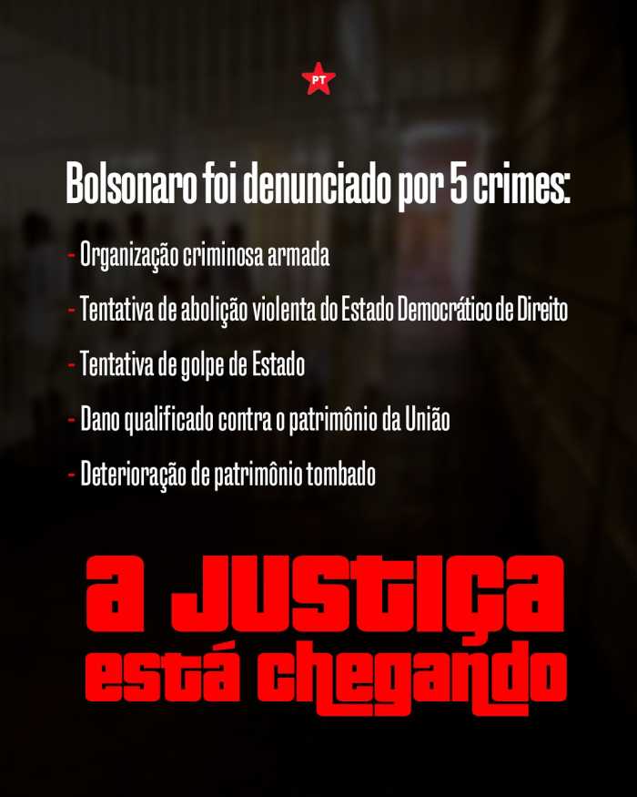 Foto: Lula Marques / Agência Brasil As redes sociais do PT Brasil postaram uma arte colocando o ex-presidente Jair Bolsonaro 'atrás das grades'.