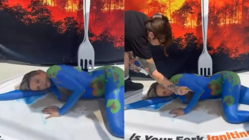 Pintada com o desenho do planeta Terra e com o corpo deitado em um prato cenográfico, Luisa Mell encenou uma performance ao lado de um cartaz com a mensagem: “Comer animais alimenta o fogo. Por favor, seja vegano”. O protesto foi realizado em parceria com a PETA (People for the Ethical Treatment of Animals), organização internacional de defesa dos direitos dos animais.
