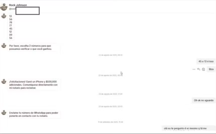 Prints divulgados pela investigação mostram conversas em que o perfil que se apresenta como “Rock Johnson” pede que a vítima escolha números, informa o falso prêmio e, em seguida, solicita o número de WhatsApp para continuar o contato.