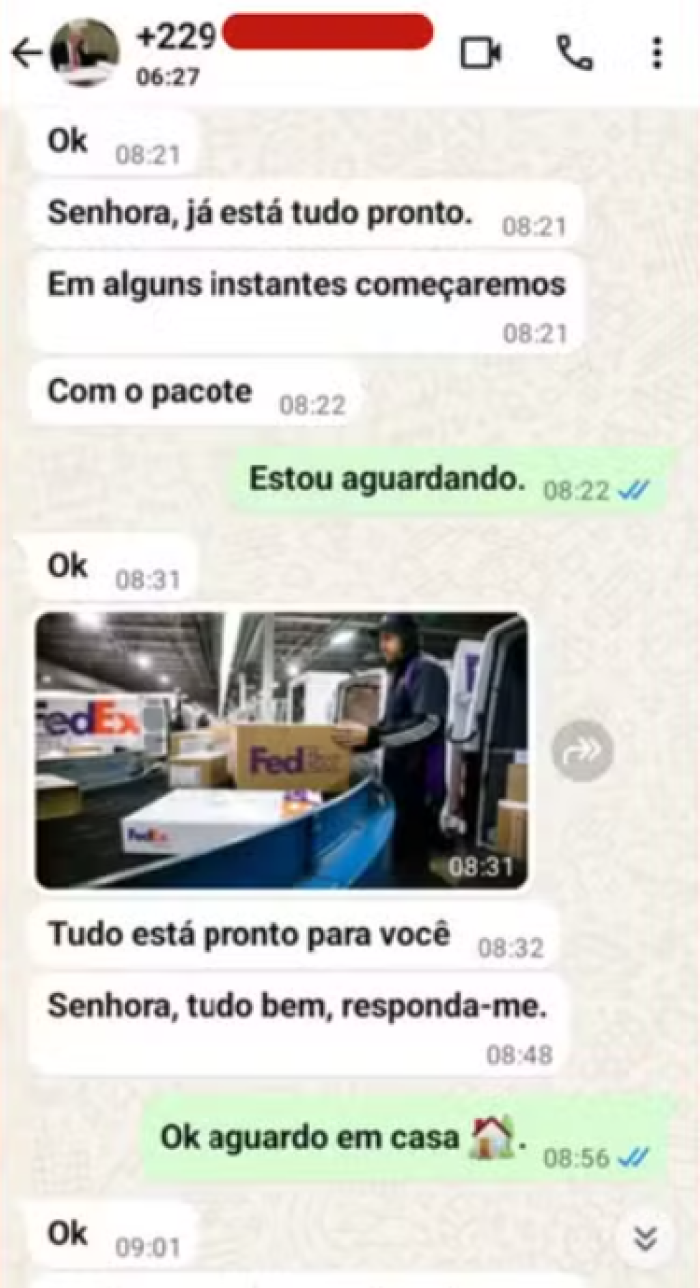 O esquema era reforçado com o envio de documentos falsificados, fotos de pacotes lacrados, mensagens em inglês e supostos comprovantes de entregas internacionais, para dar aparência de legitimidade à fraude.