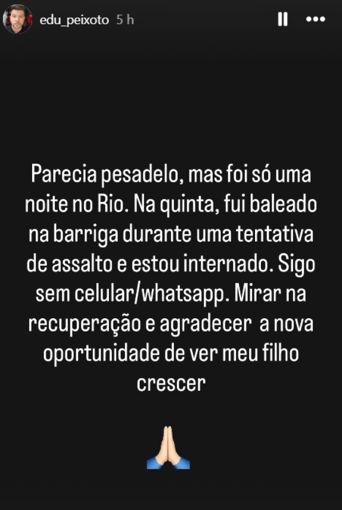 "Parecia pesadelo, mas foi só uma noite no Rio. Na quinta, fui baleado na barriga durante uma tentativa de assalto e estou internado. Sigo sem celular/whatsapp. Mirar na recuperação e agradecer a nova oportunidade de ver meu filho crescer", escreveu.