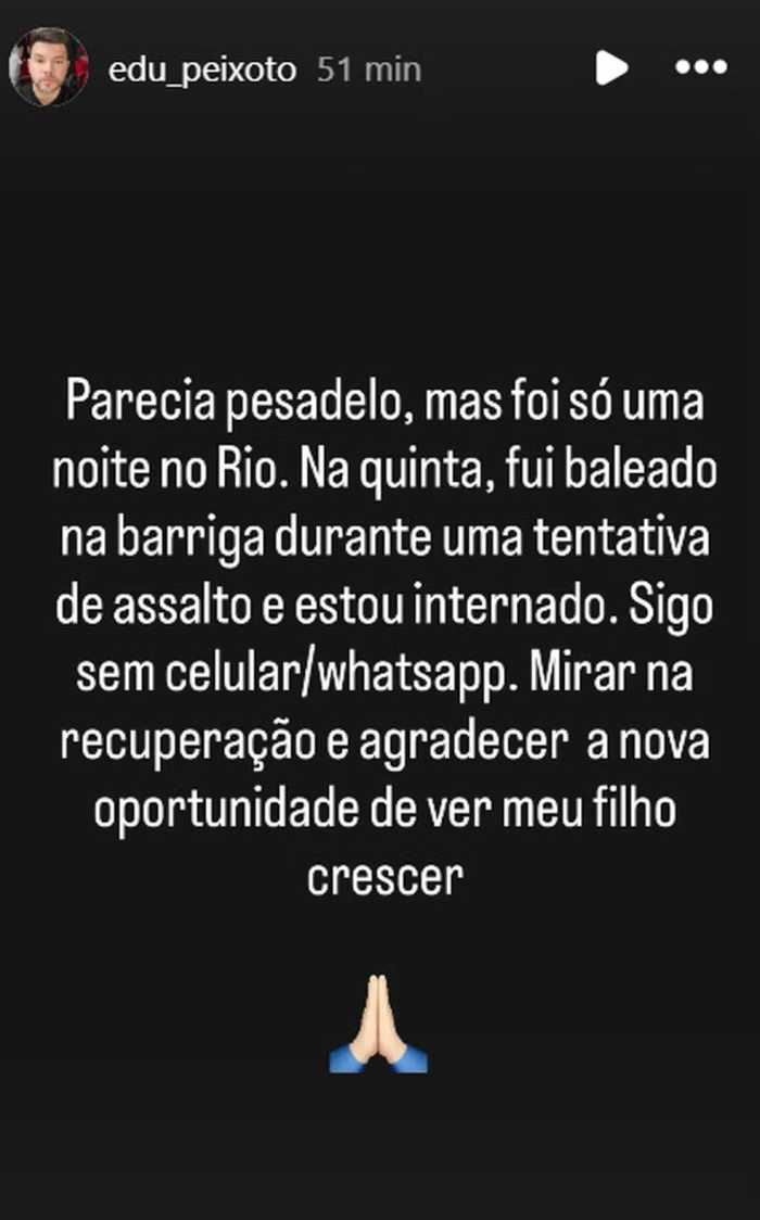 "Sigo sem celular/Whatsapp. Mirar na recuperação e agradecer a nova oportunidade de ver meu filho crescer", disse Eduardo Peixoto, no Instagram.